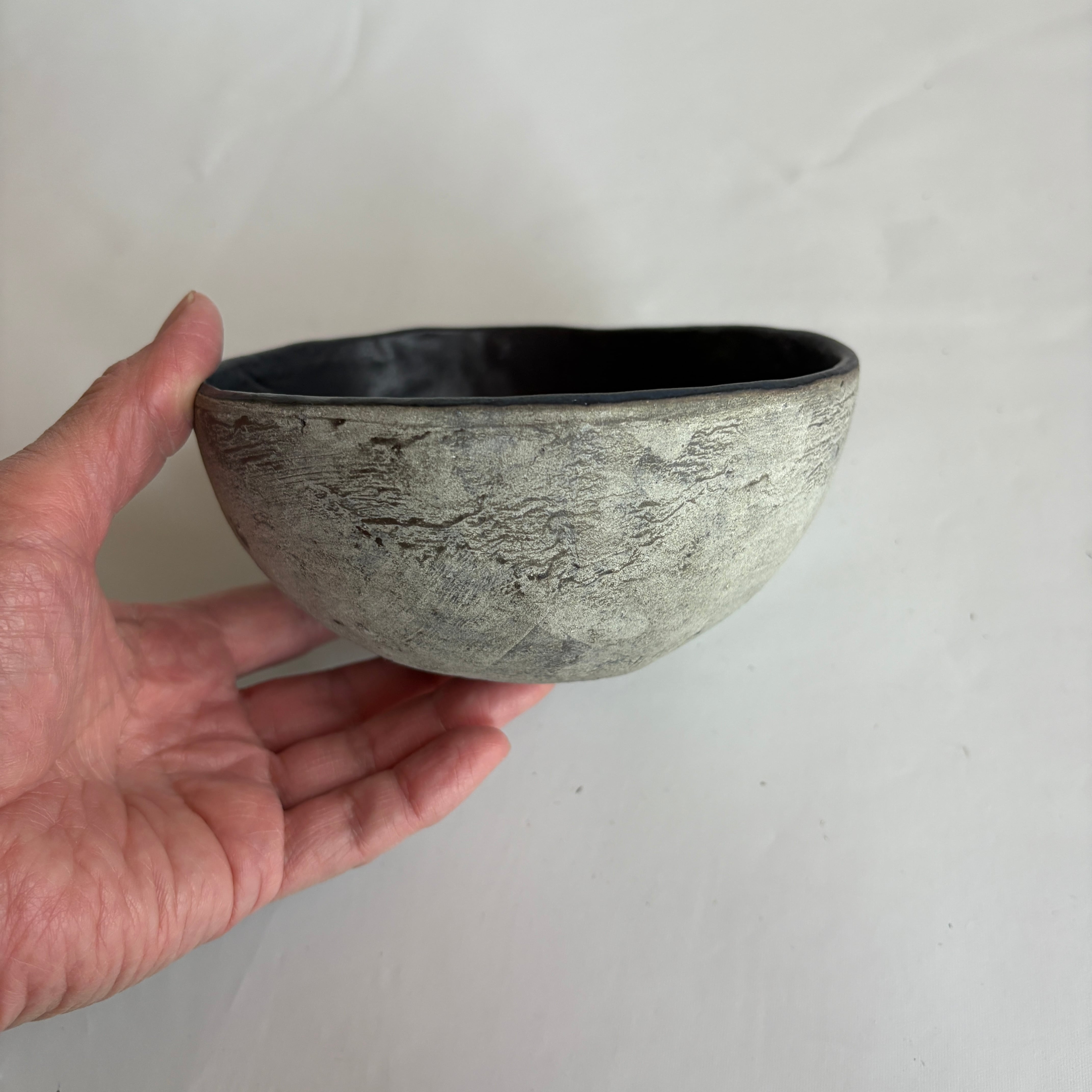 化粧土を表面に施しているので、土の手触りをダイレクトに感じられて温かみの増す作品になっています。何気ないおかずをあえて少なめに高さを出して盛ると、引き締まった黒の効果で美しくみせてくれます。鍋物の取り鉢やサラダにも。