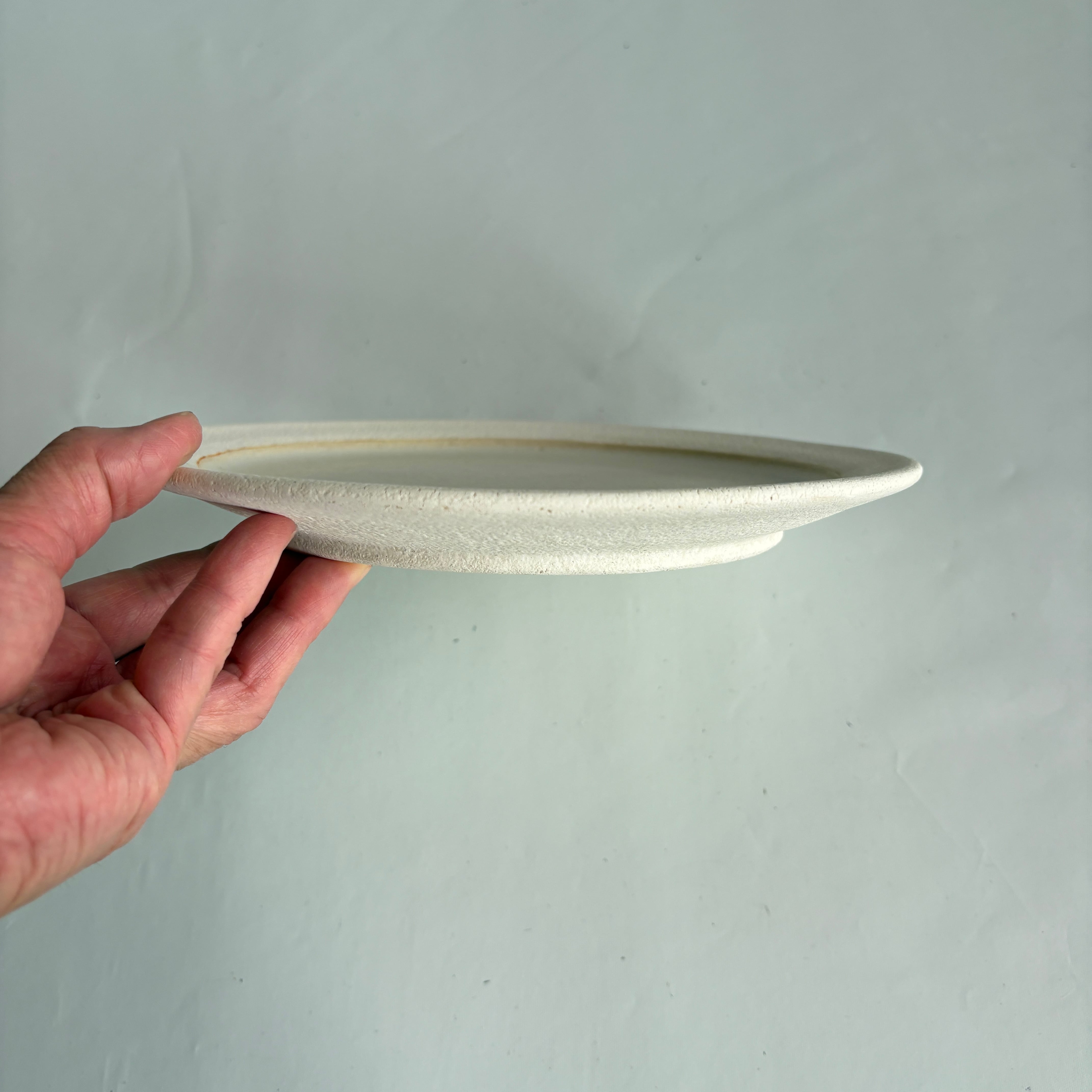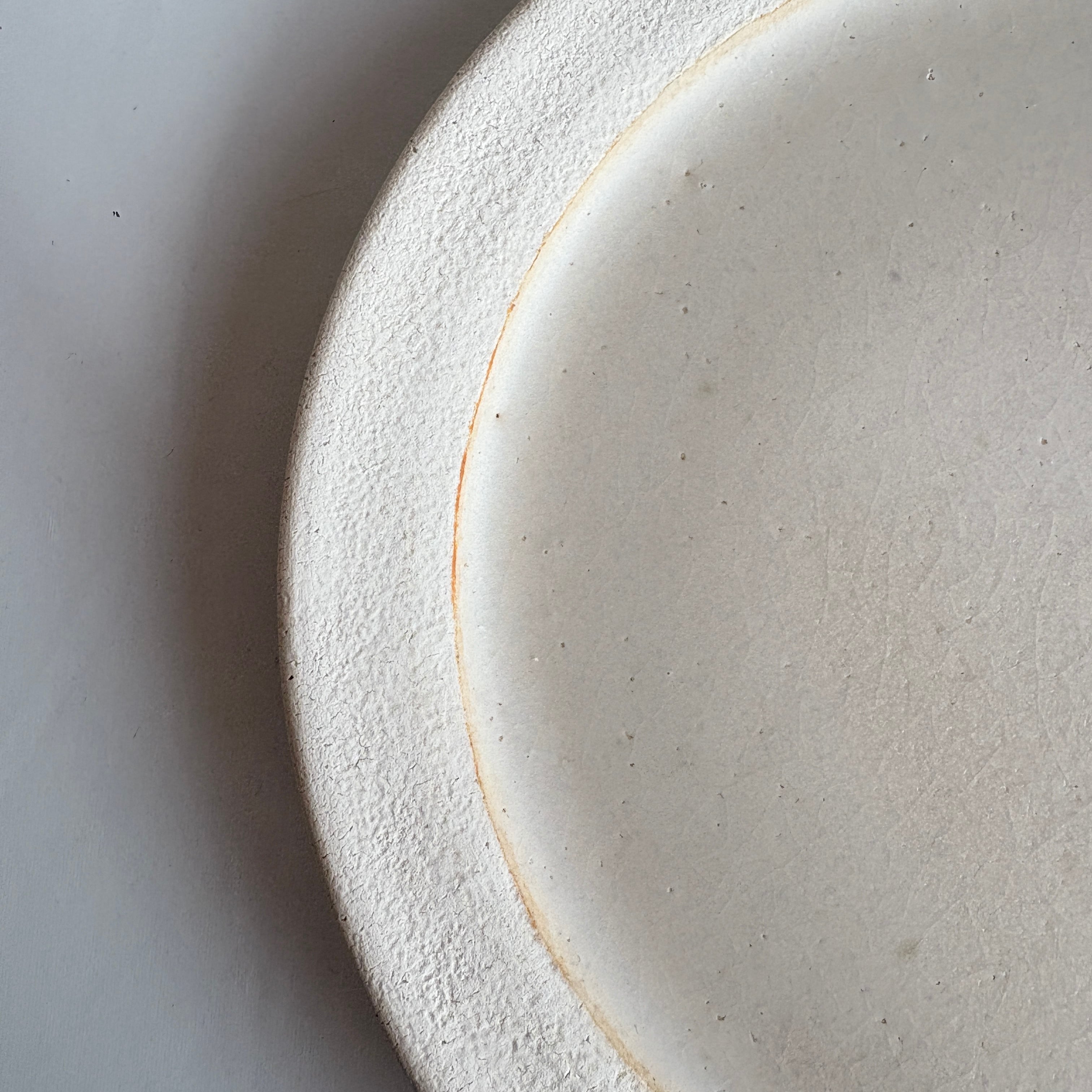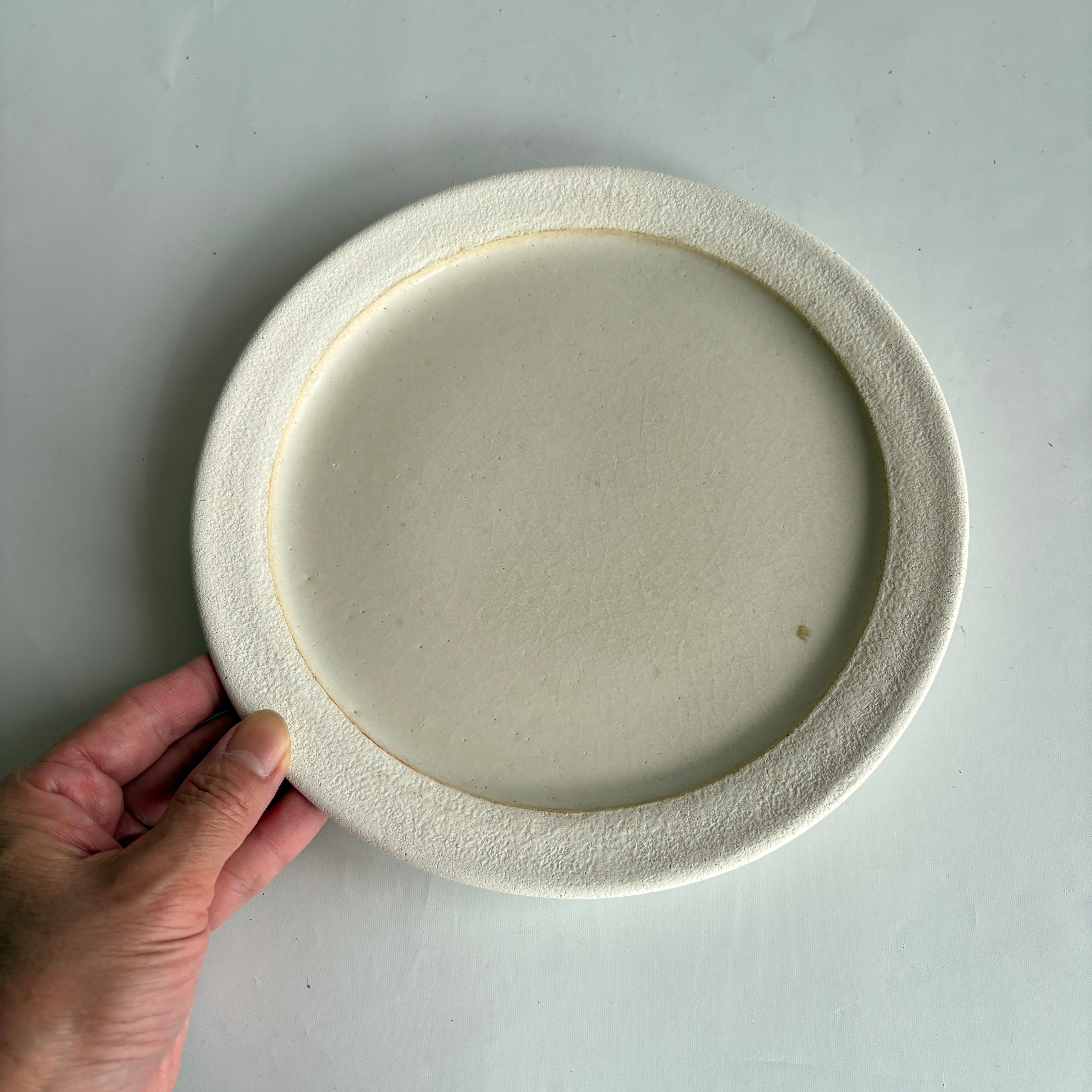どんなお料理でも受けとめてくれそうなニュアンスのある白い器。プロダクトでは出せないこだわりのある白を選びたいという方にぜひ使っていただきたいです。程よい重みと厚みがあり、シンプルですがとても存在感があります。リム部分が白化粧になっています。前菜やデザートを美しく引き立ててくれる、おもてなしの一皿としてもピッタリです。1枚目のお色が実物に近いです