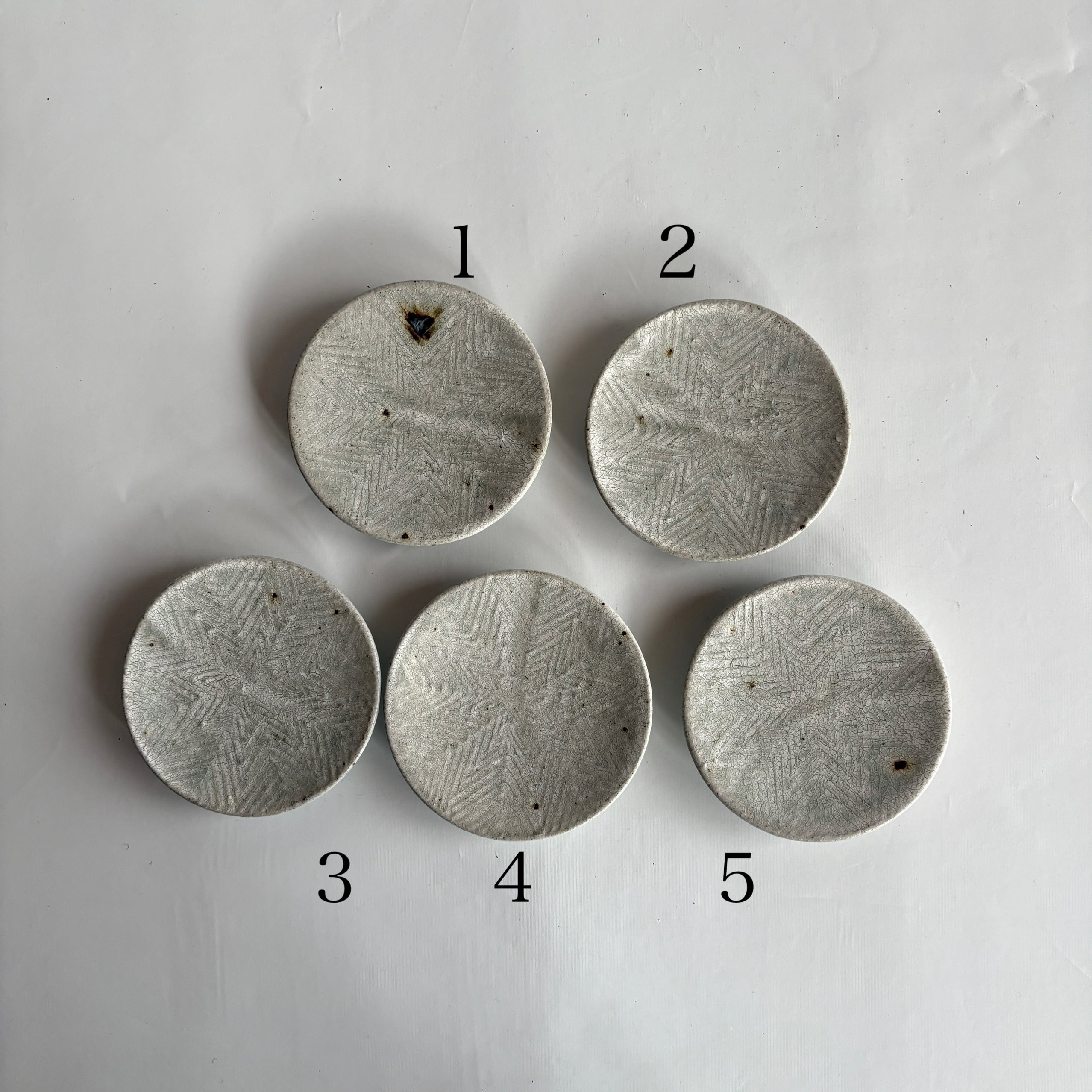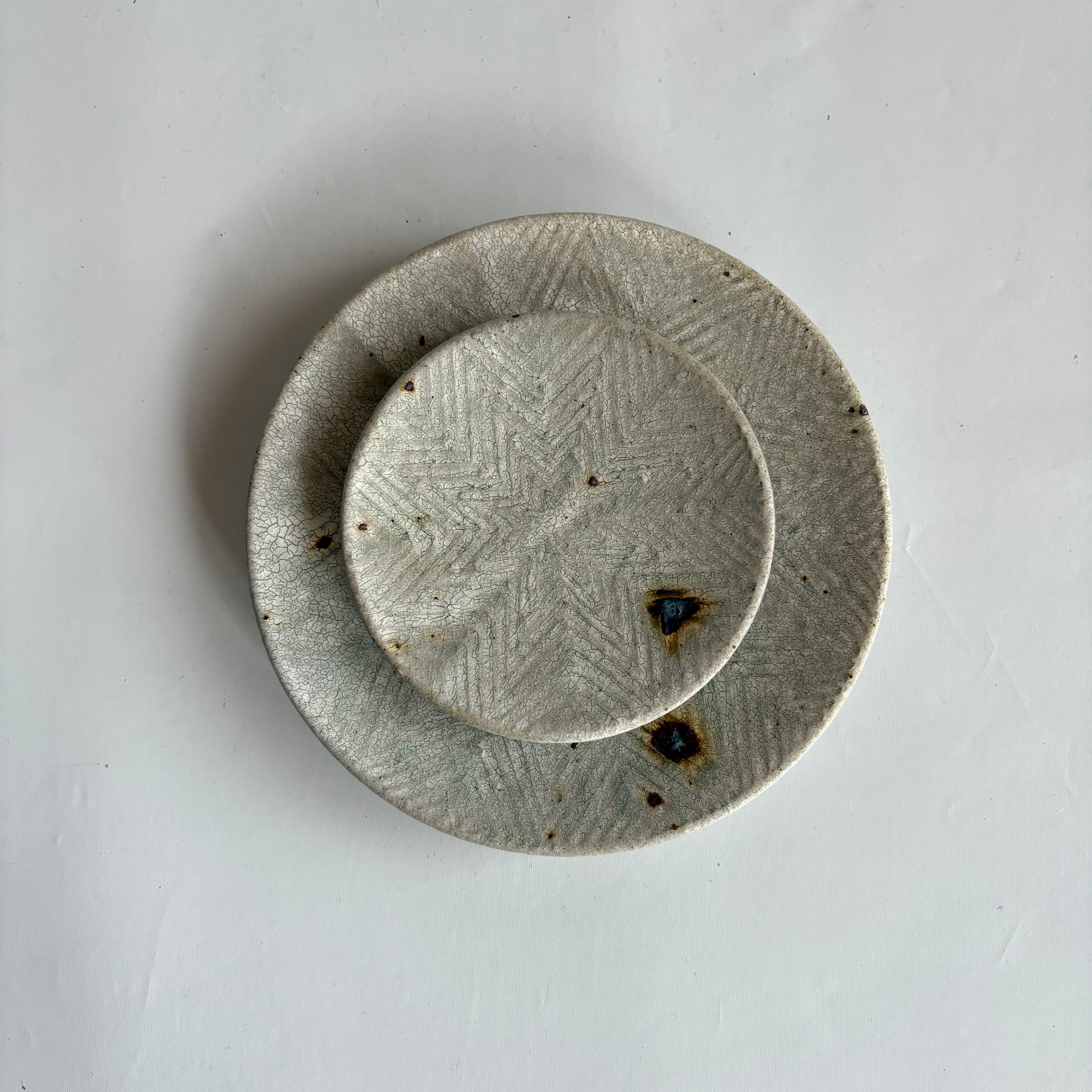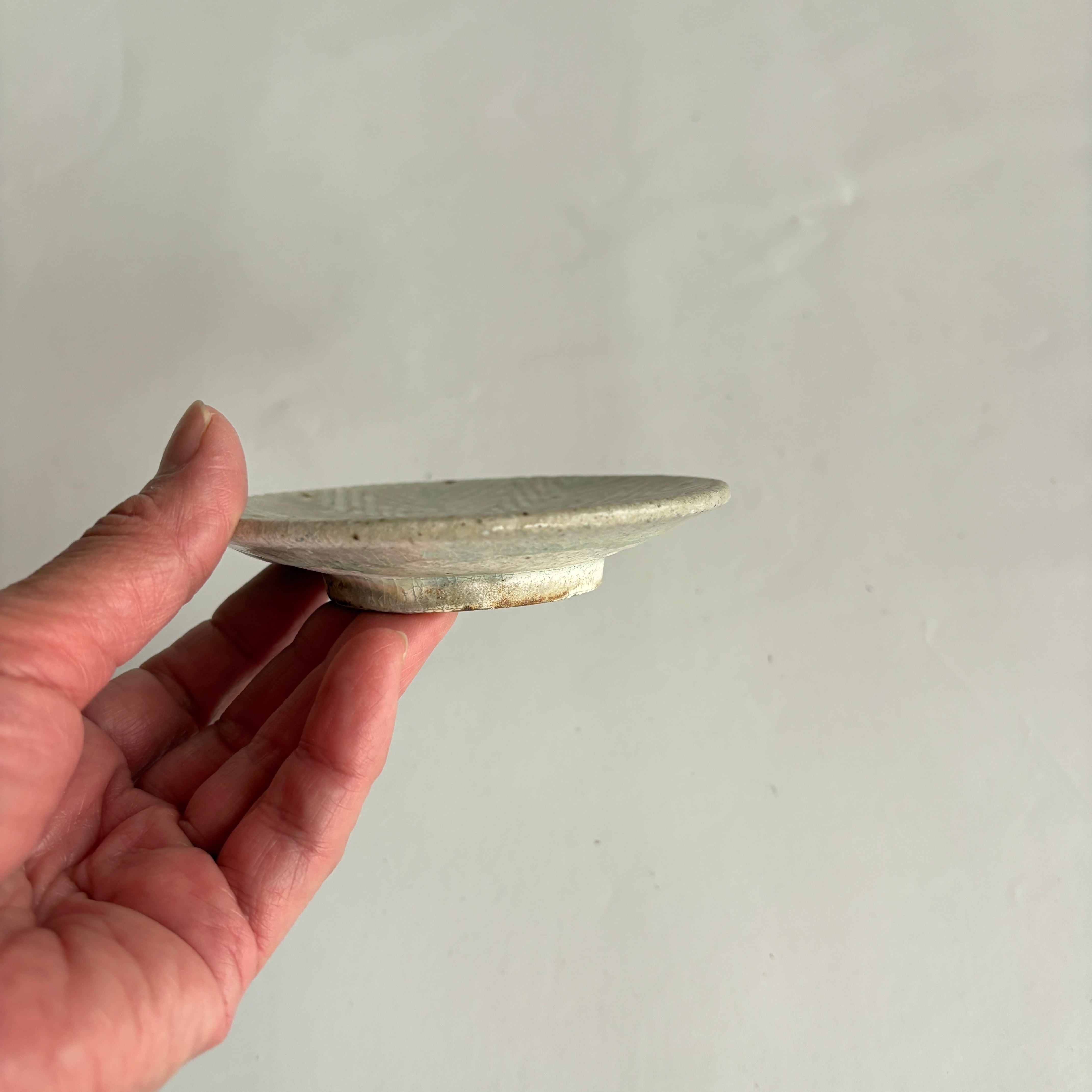 ヘリンボーンと言われる独特の文様の上に白い化粧土がかかり、さらに薄緑に見える釉薬が美しい作品。釉だまりが見られるものもあります。