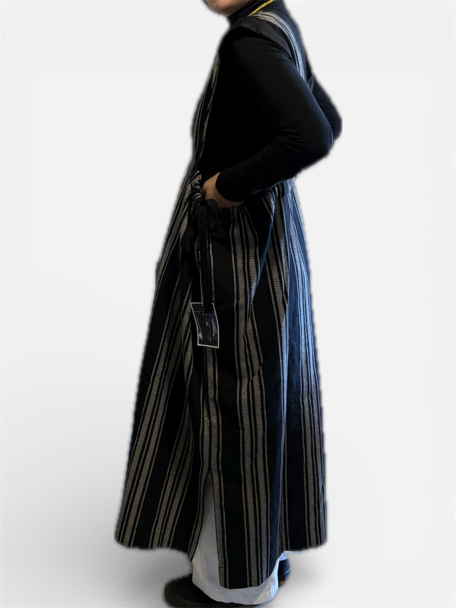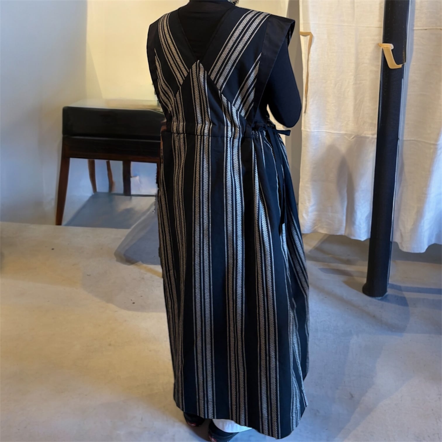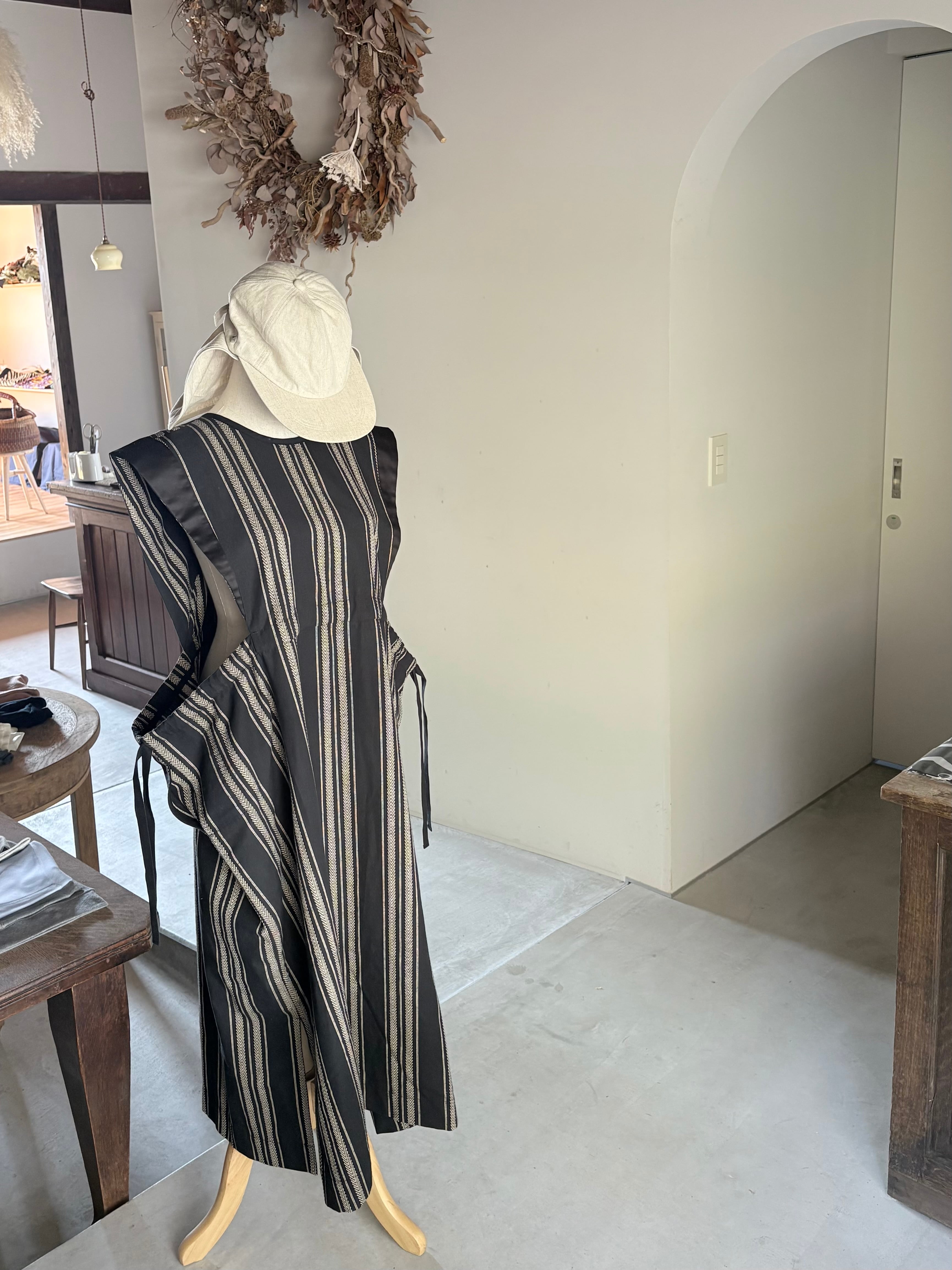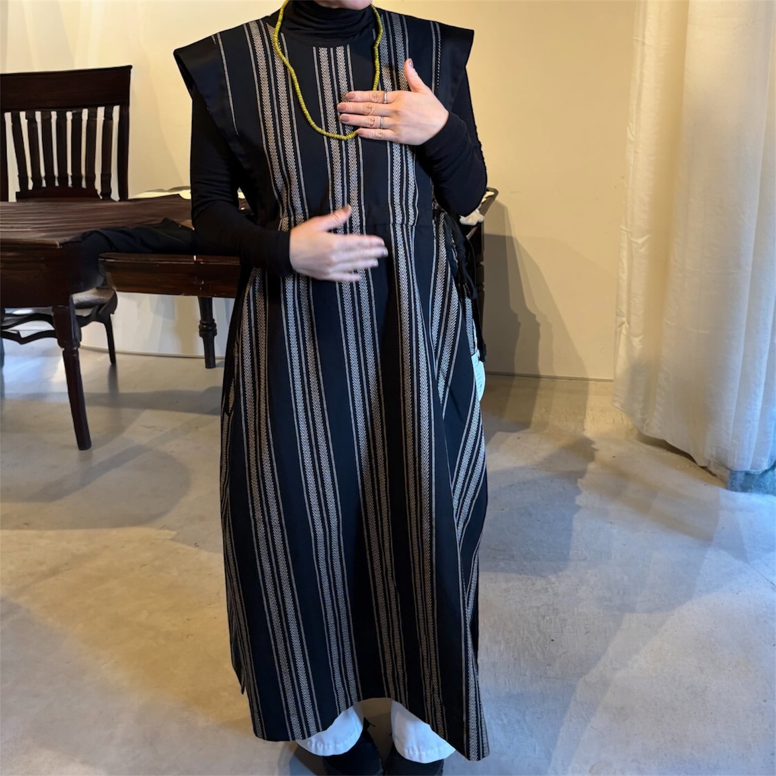 エプロンワンピのような形ですが、肩の開きが二の腕をカバー、ストライプも縦長効果抜群で、体型関係なく着こなせそうです。