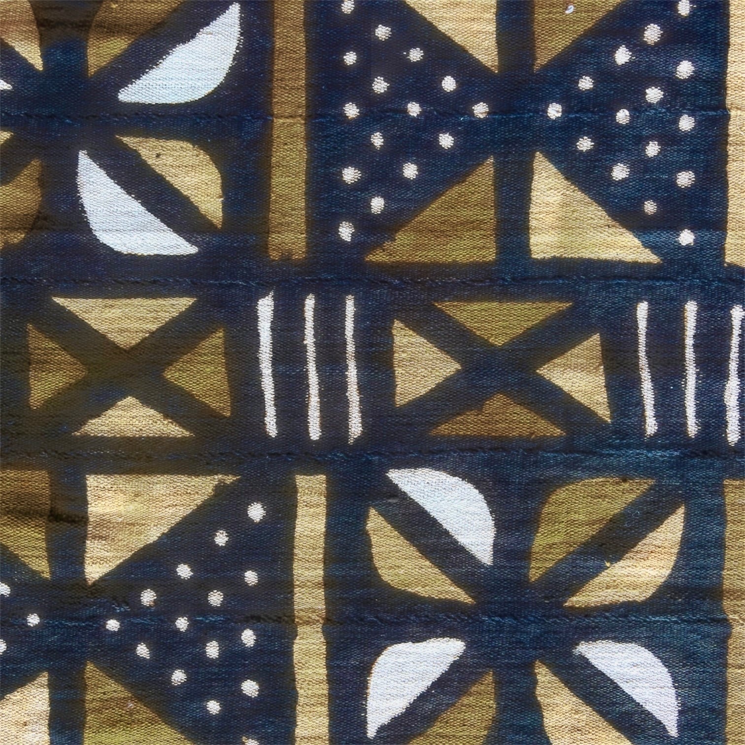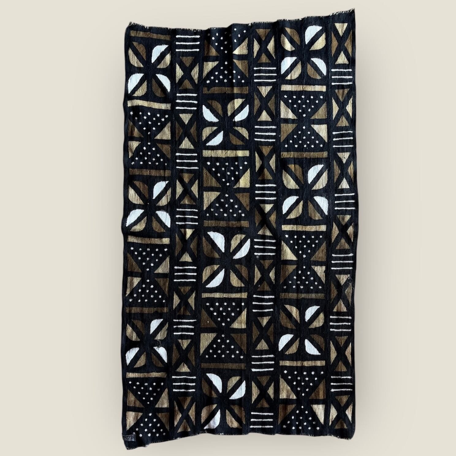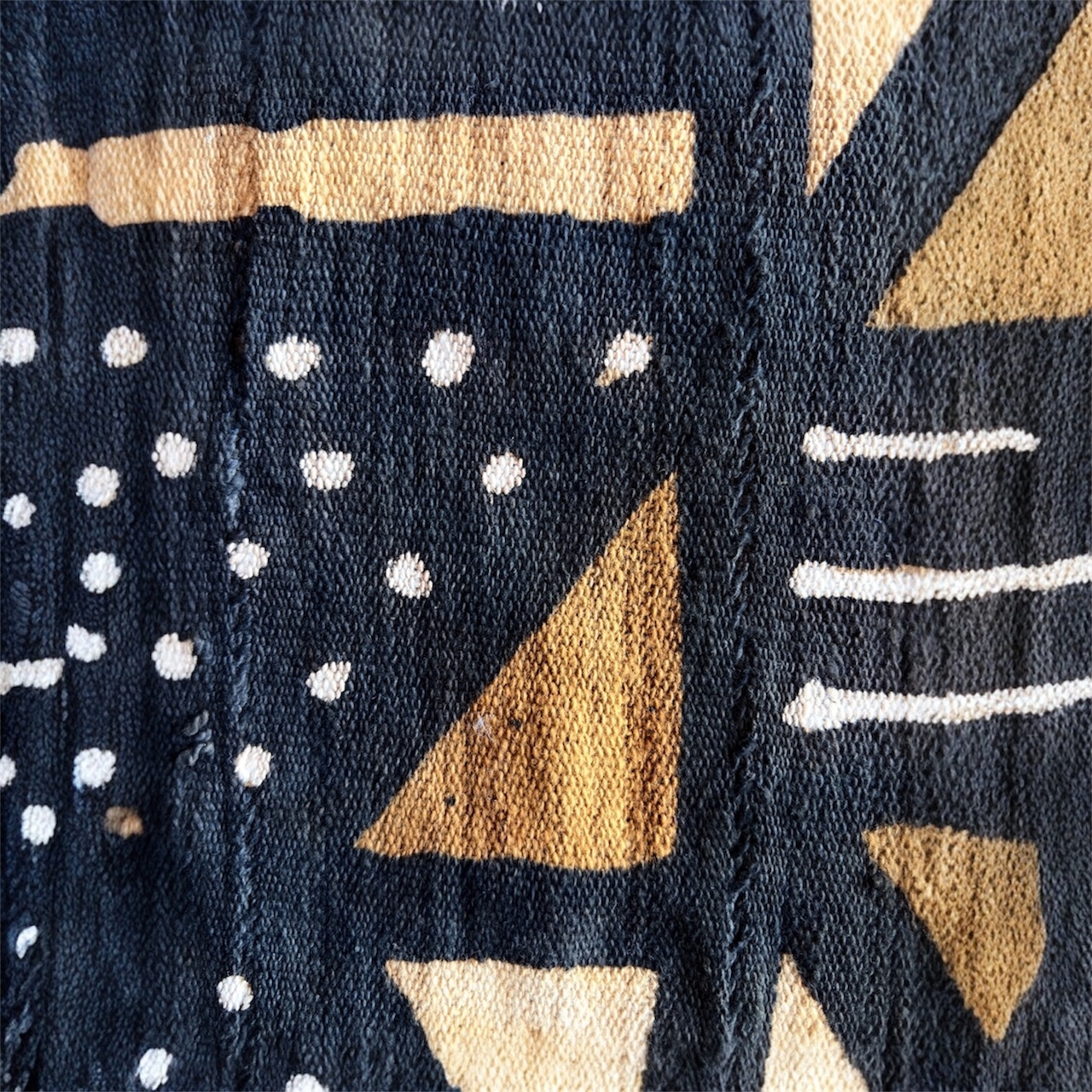 ボゴは泥という意味の、アフリカ・マリ国のバンバラ族による泥染め布。手織りした白い綿布を植物染料で下染めし、その上から発酵させた泥で模様をえがいていきます。