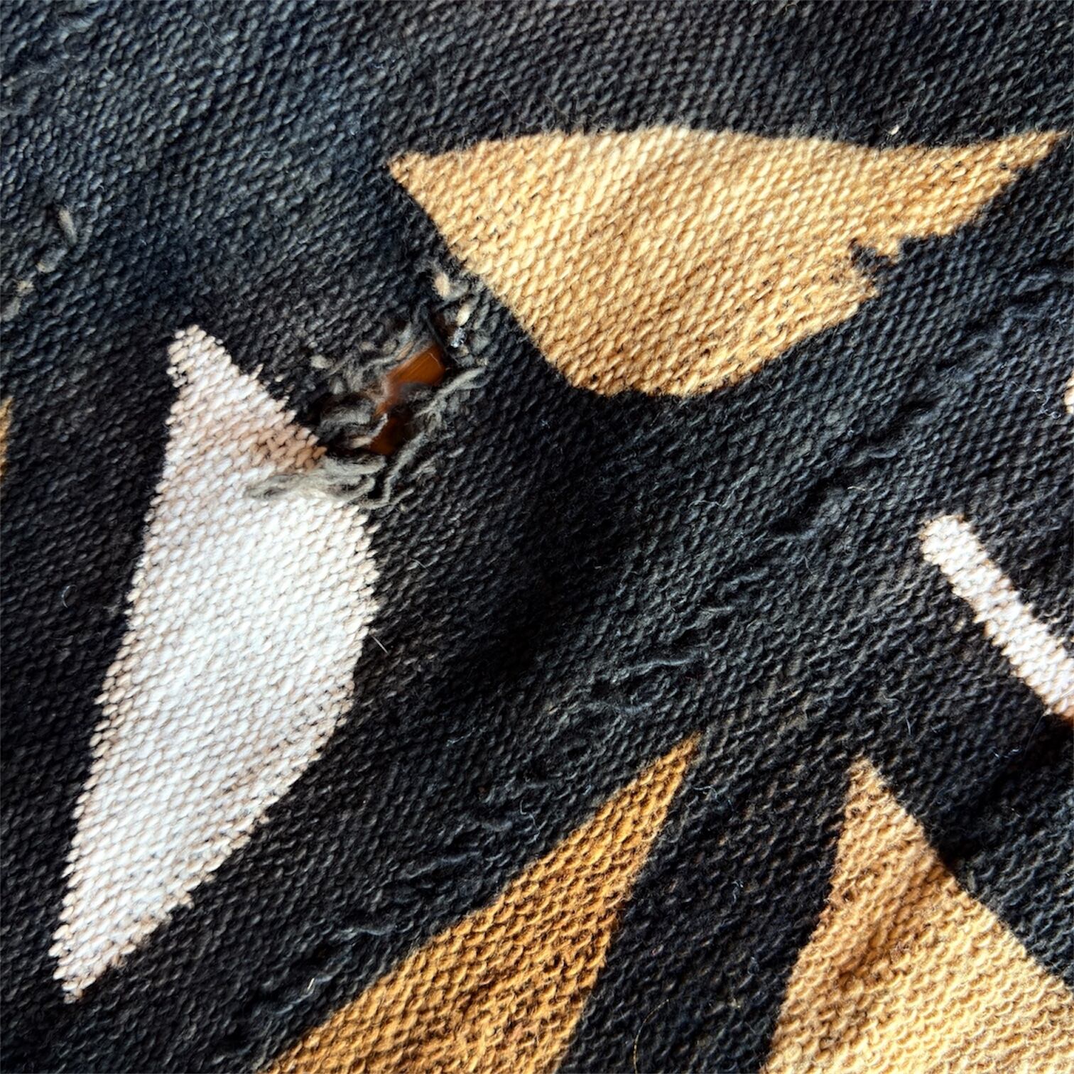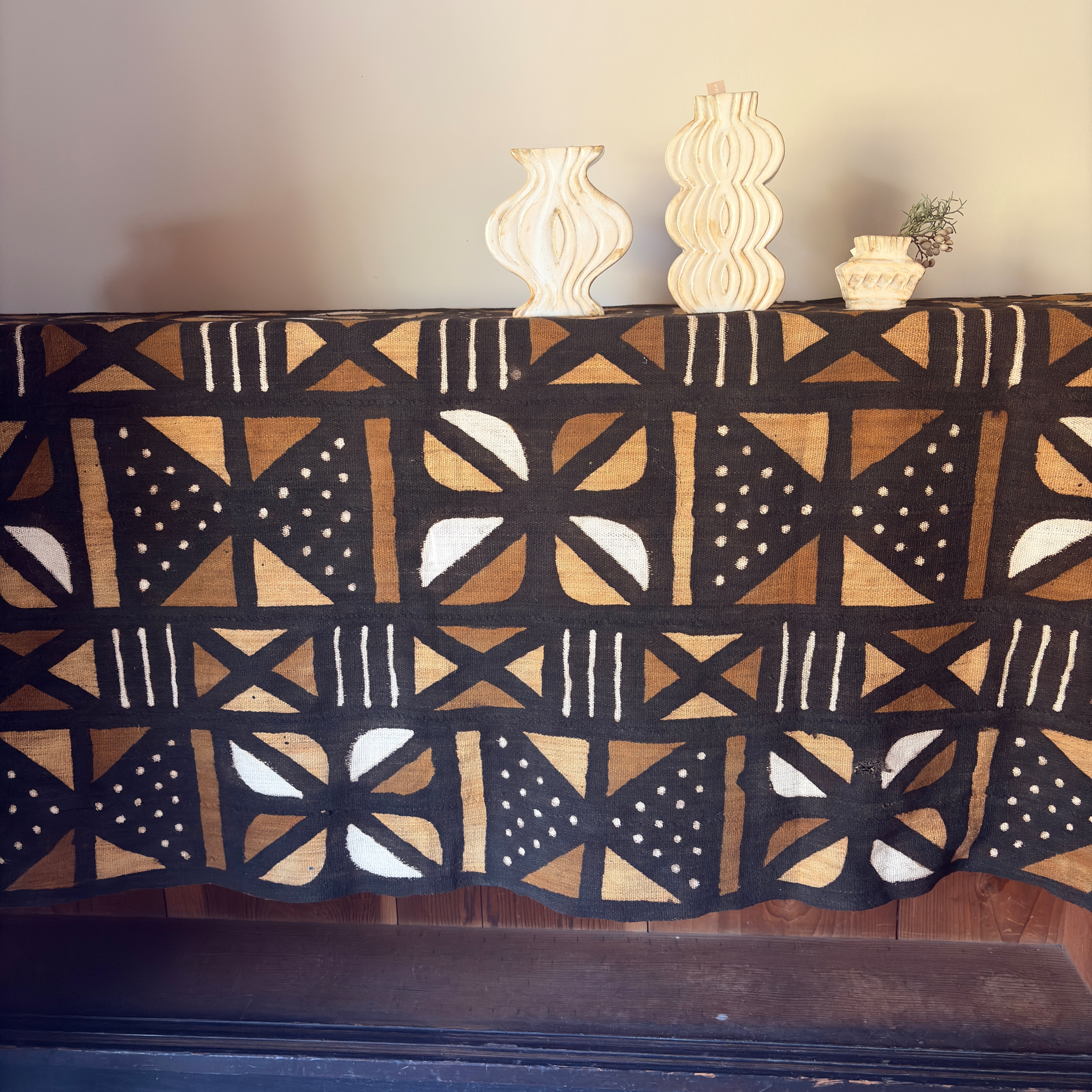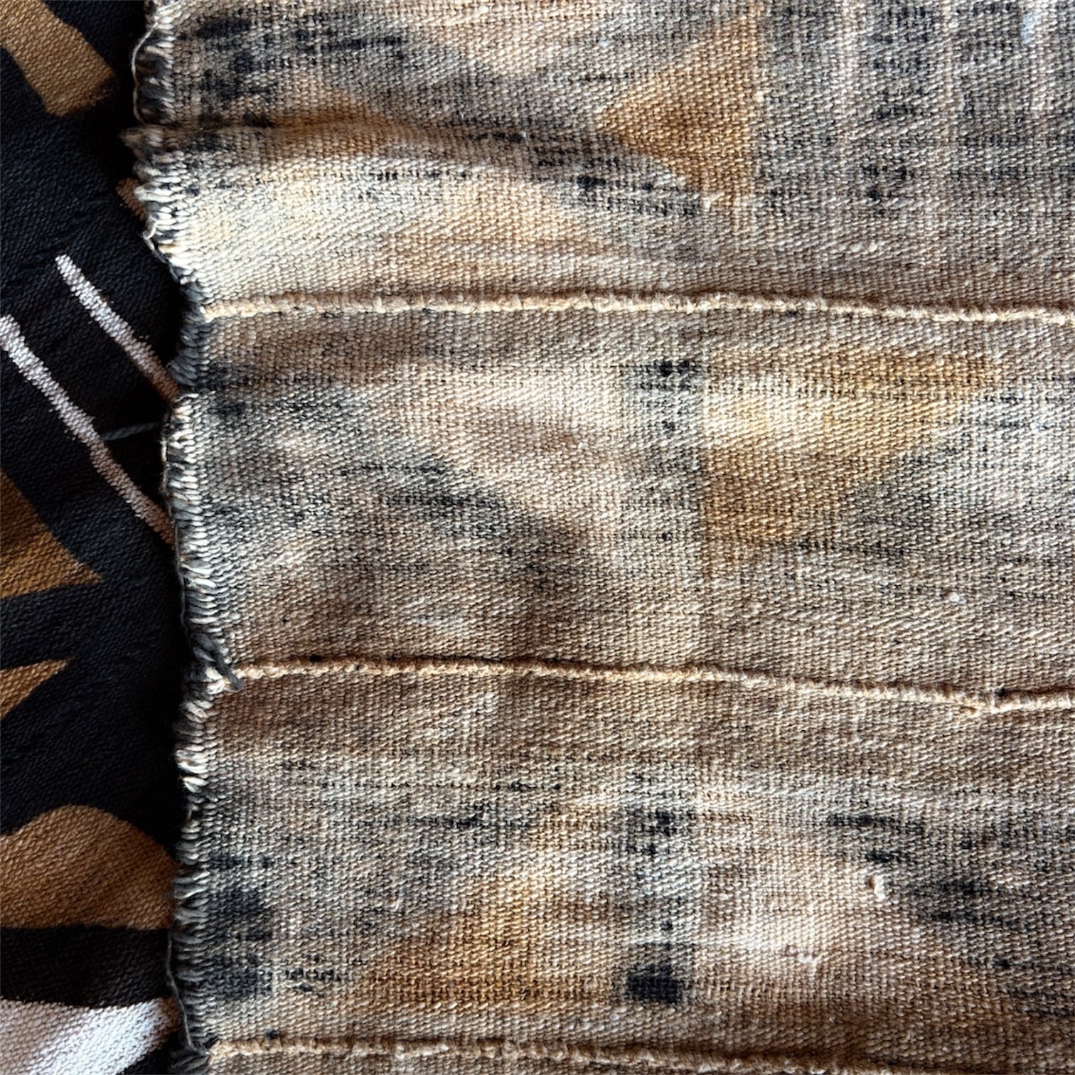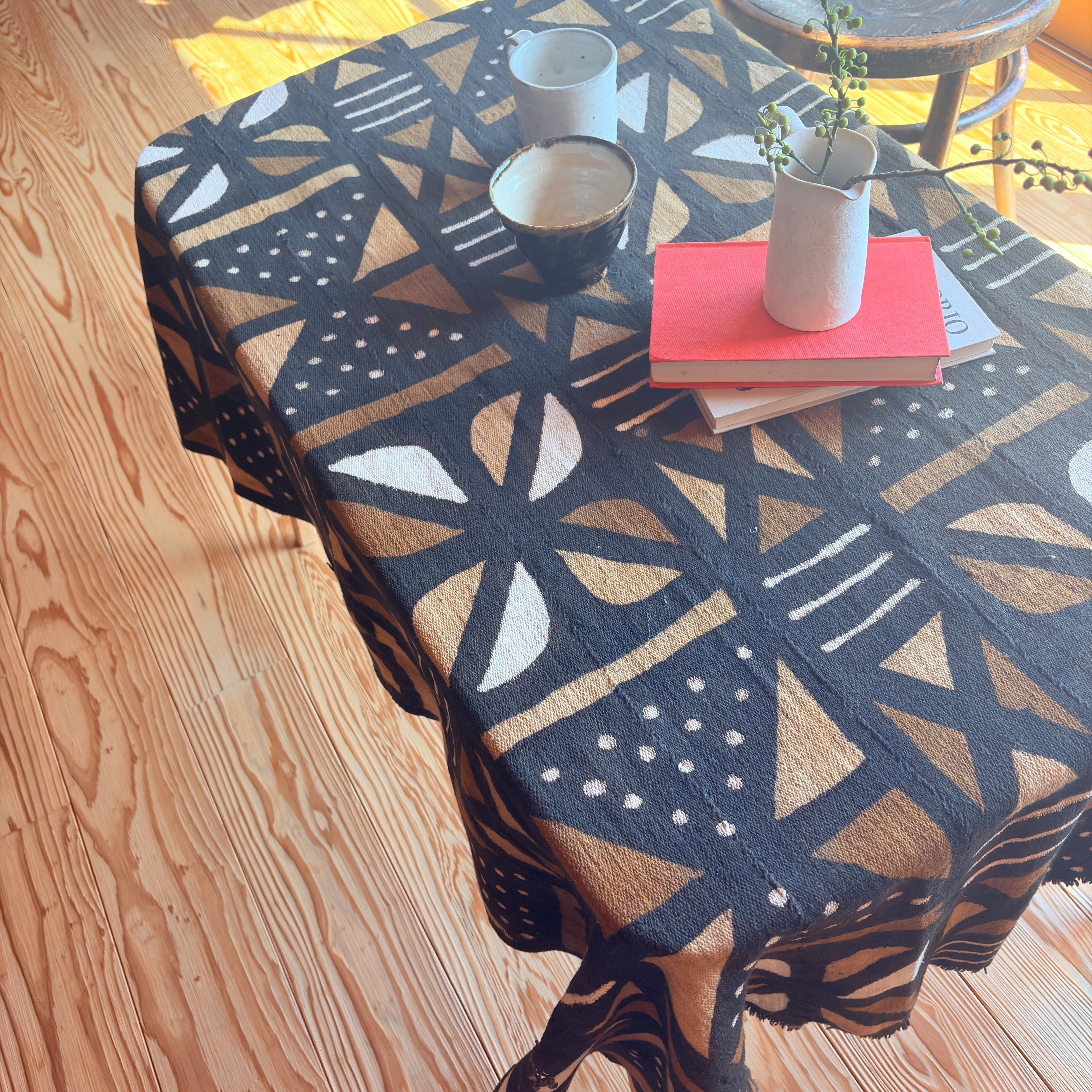 ボゴは泥という意味の、アフリカ・マリ国のバンバラ族による泥染め布。手織りした白い綿布を植物染料で下染めし、その上から発酵させた泥で模様をえがいていきます。
