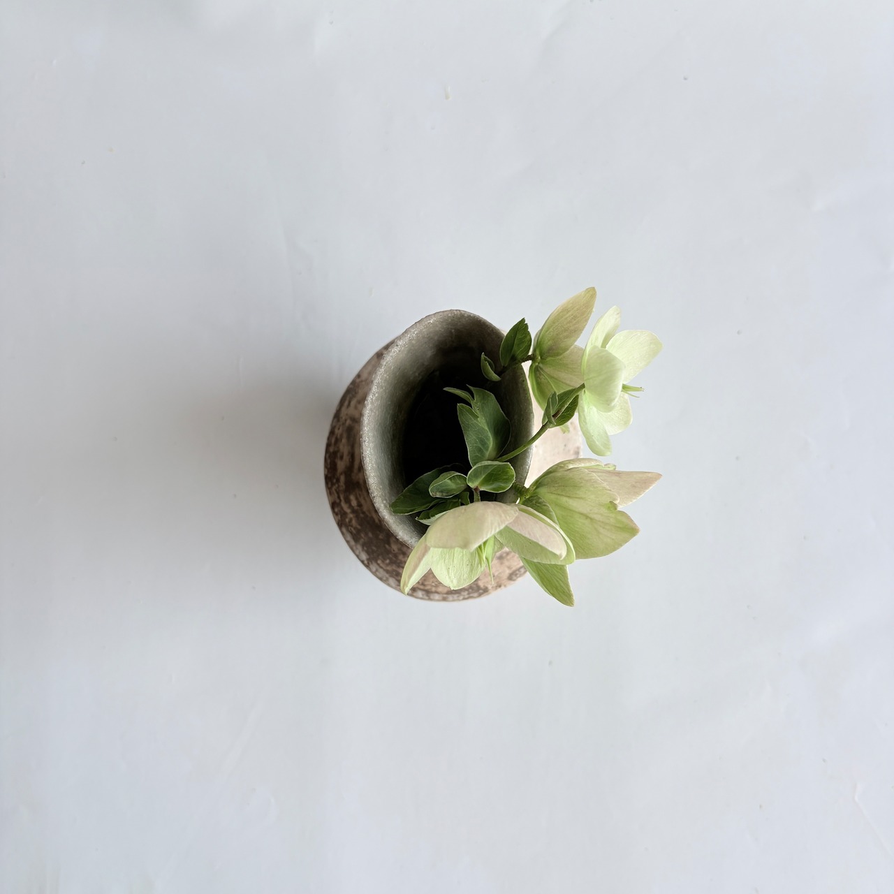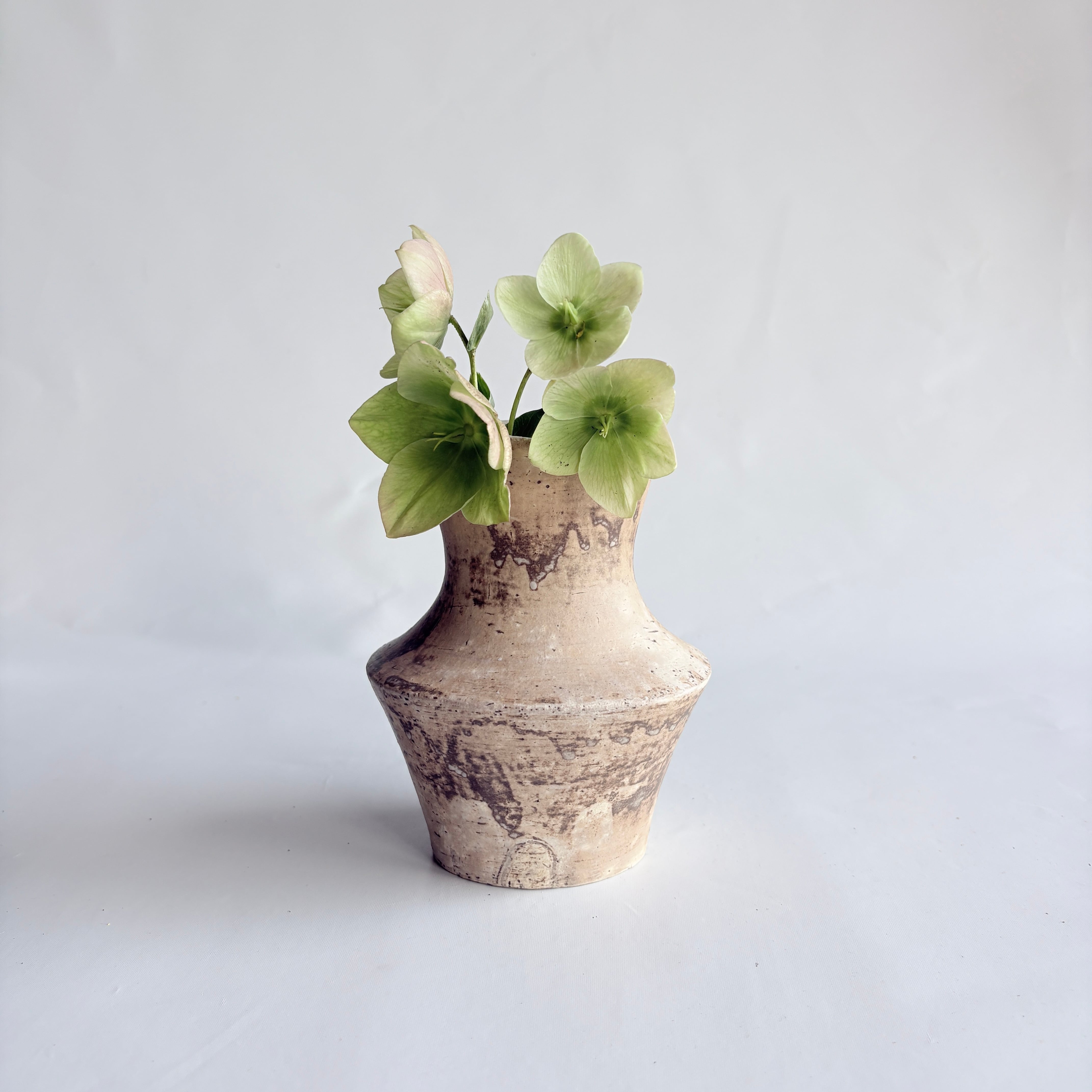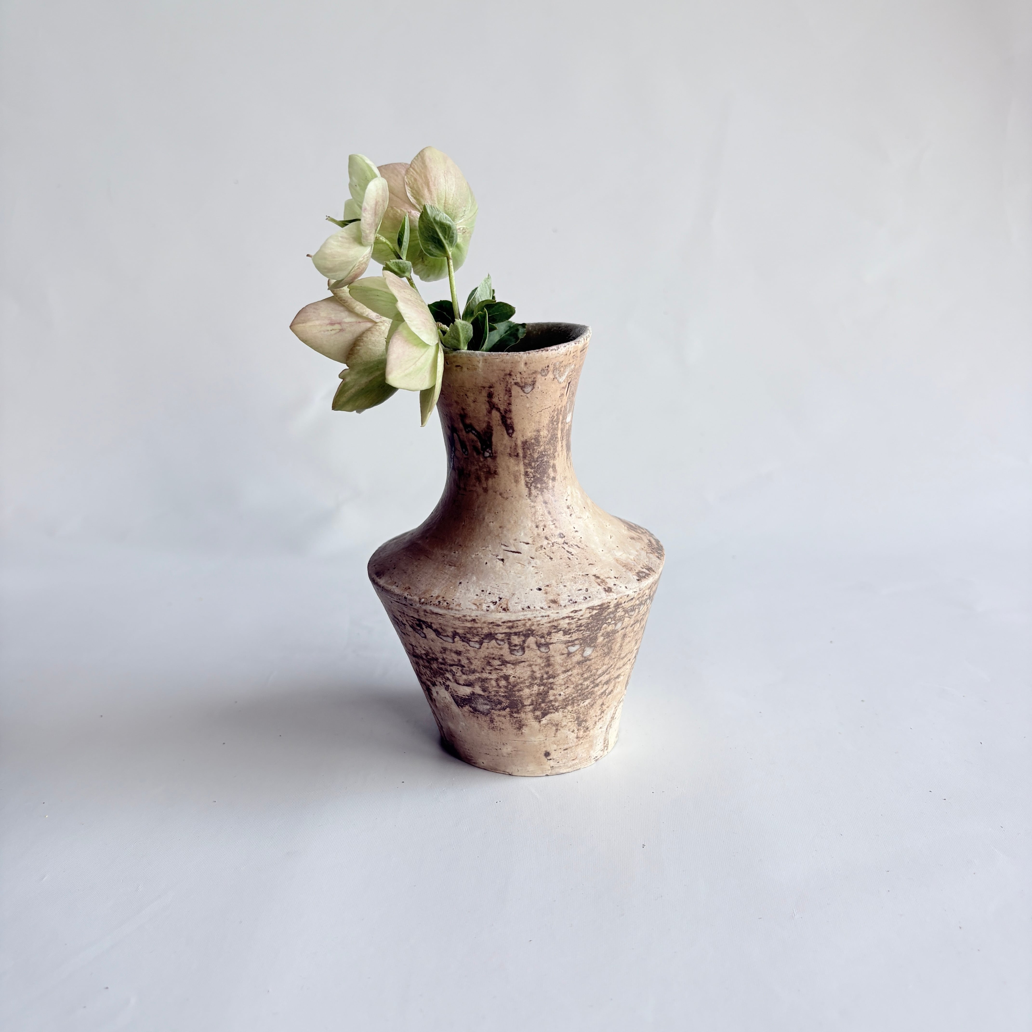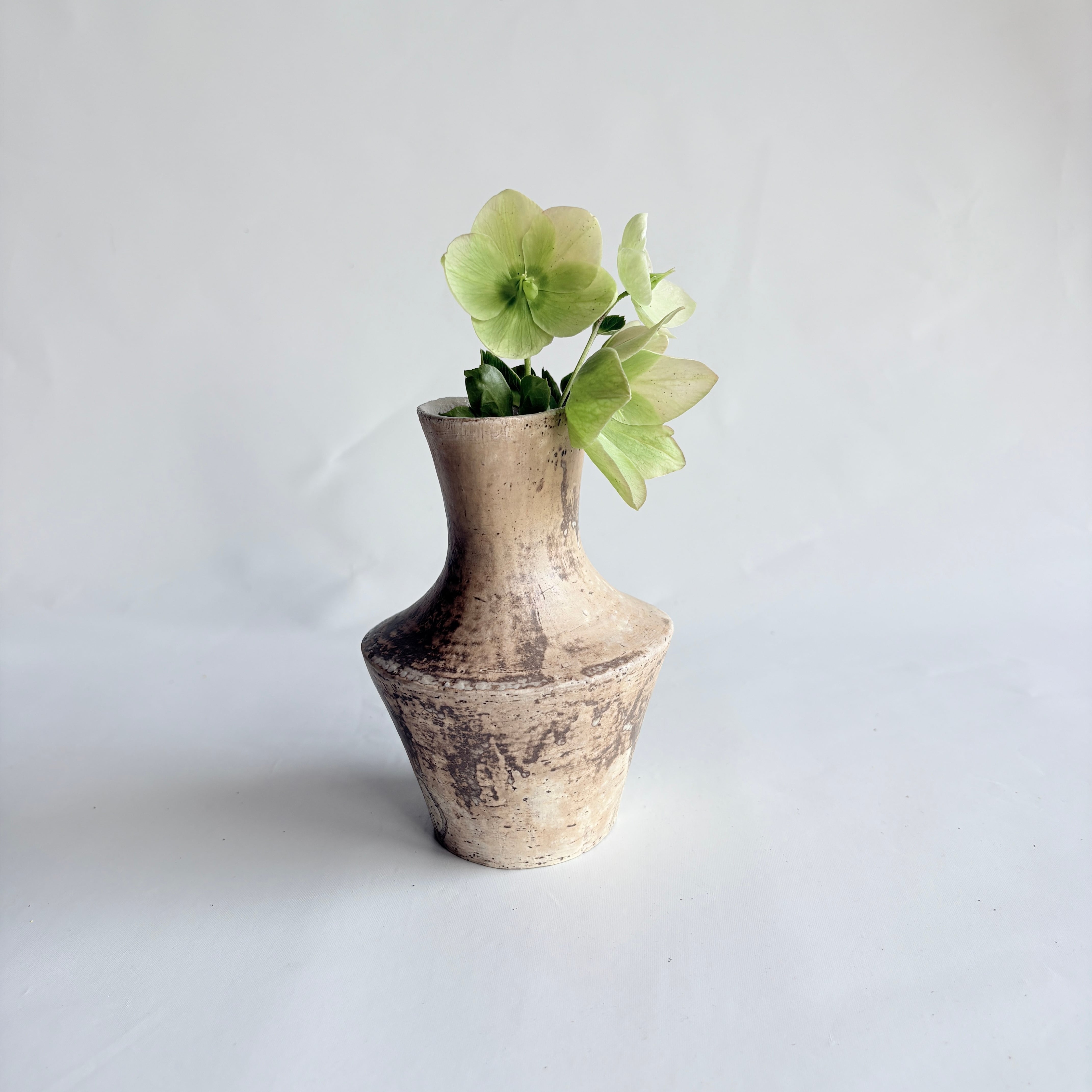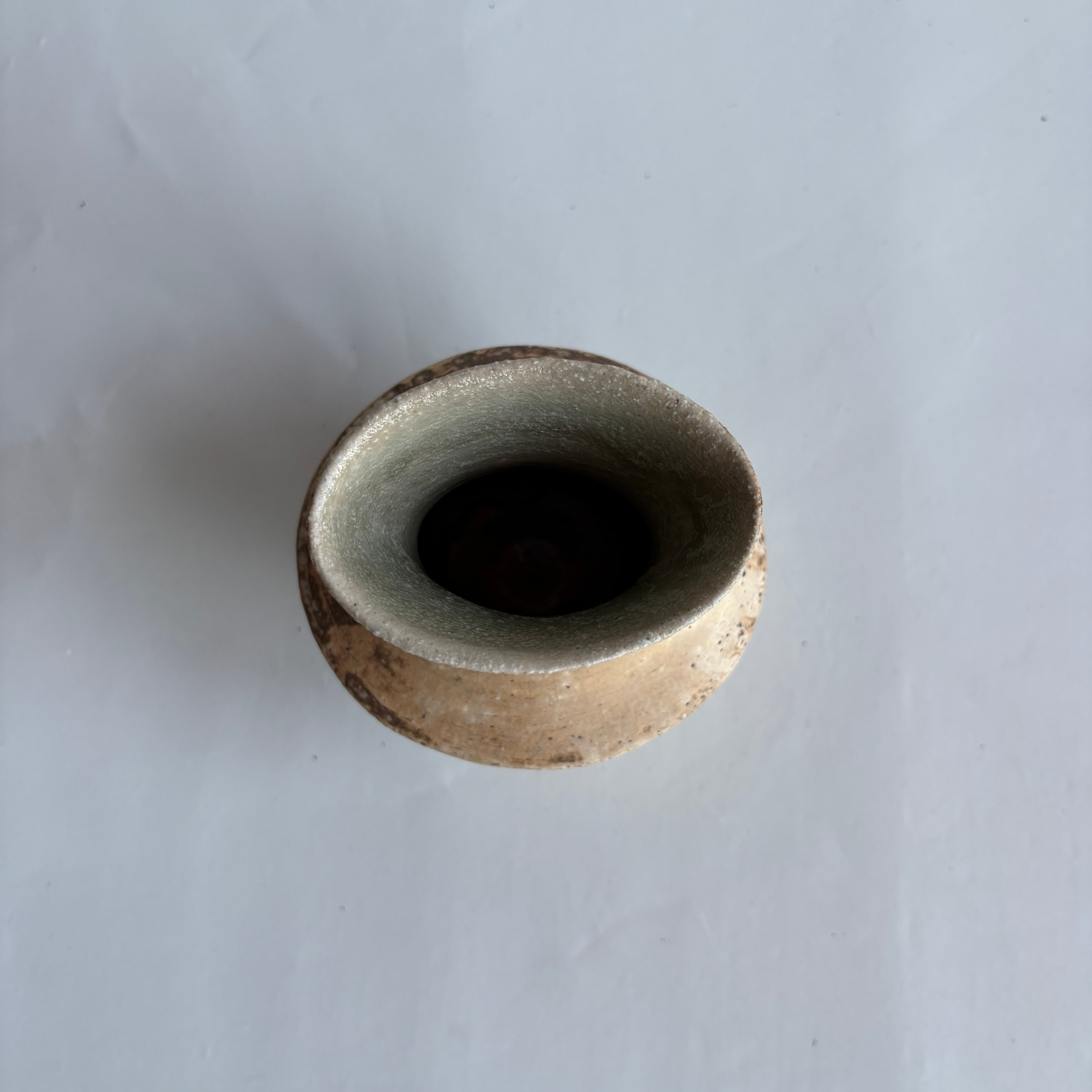 宮崎県で作陶される山脇將人さんの器。カサっとした白樺釉に灰釉が重なり、奥行きのある「枯れた白」の濃淡が生まれています。口周りが楕円状に広がる個性的な花器です。野の花が似合う佇まいです